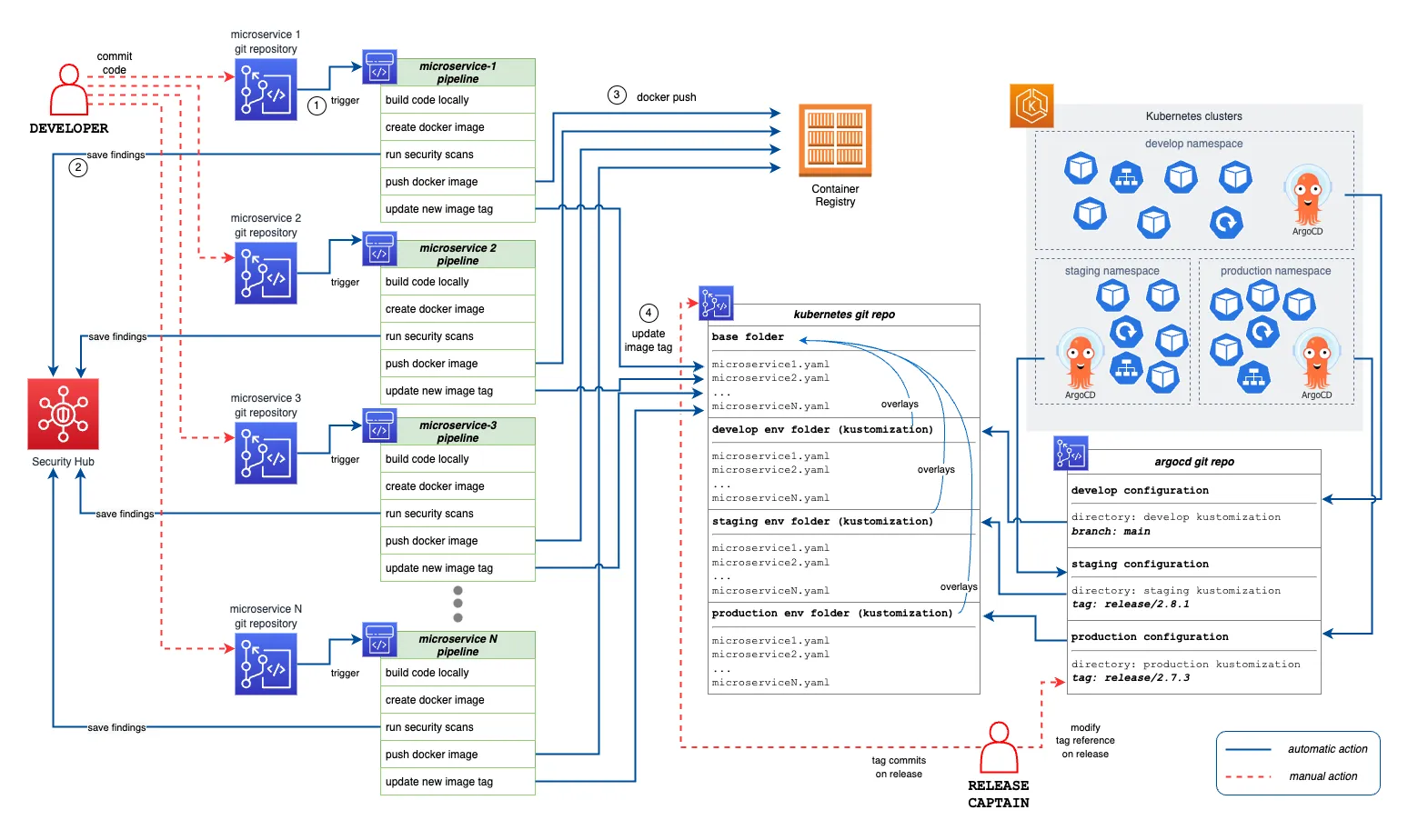 The following drawing summarizes the entire workflow, starting from the push of application code and ending with deployment to the various environments in the Kubernetes cluster.